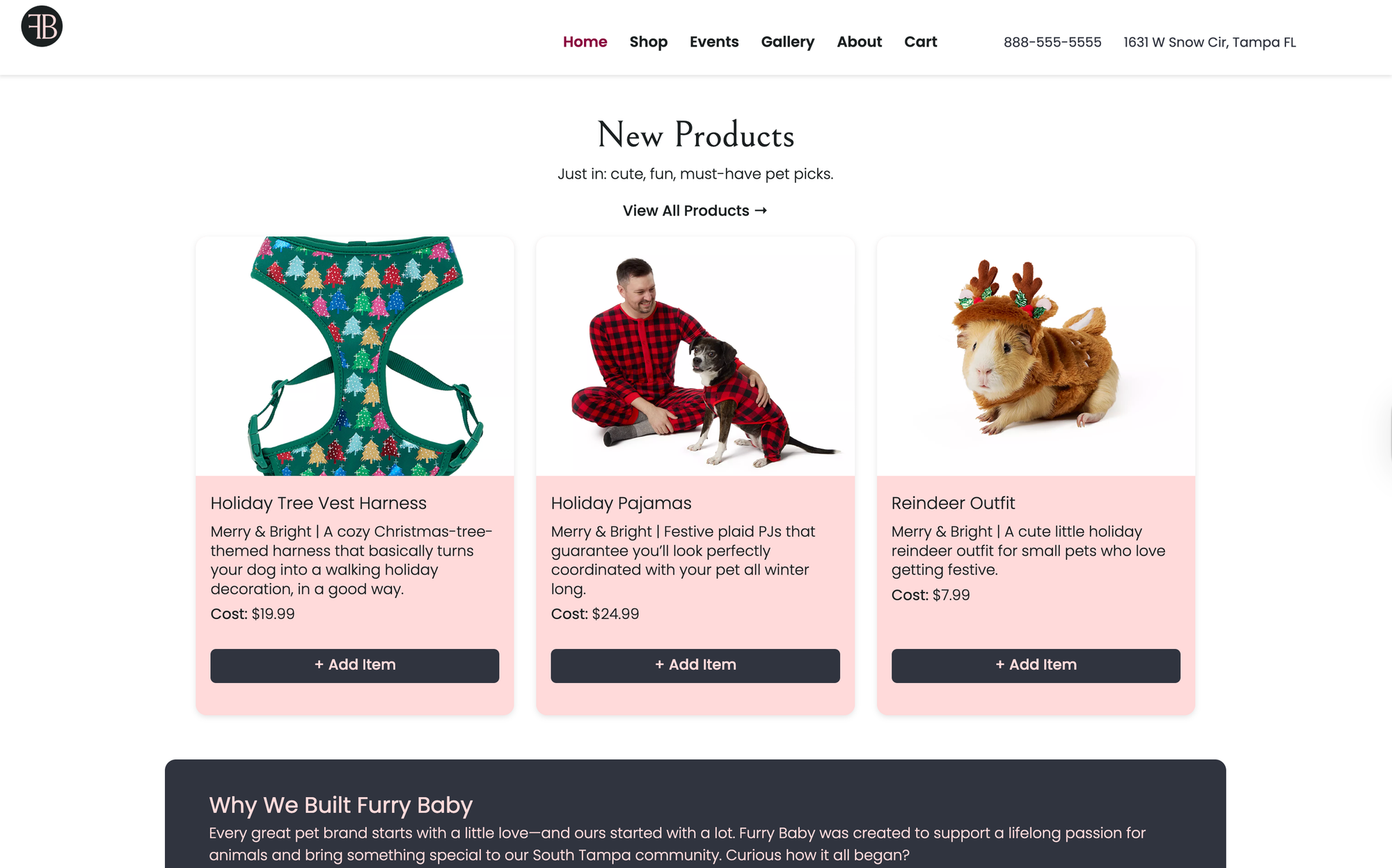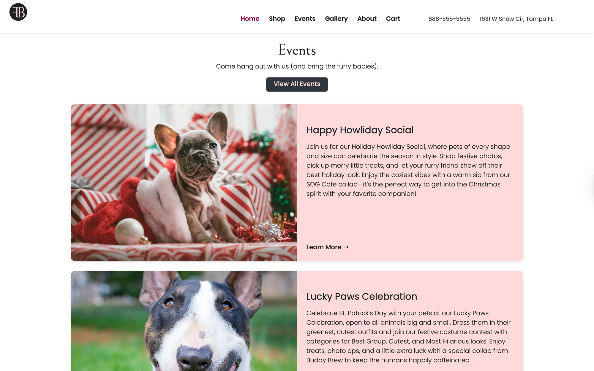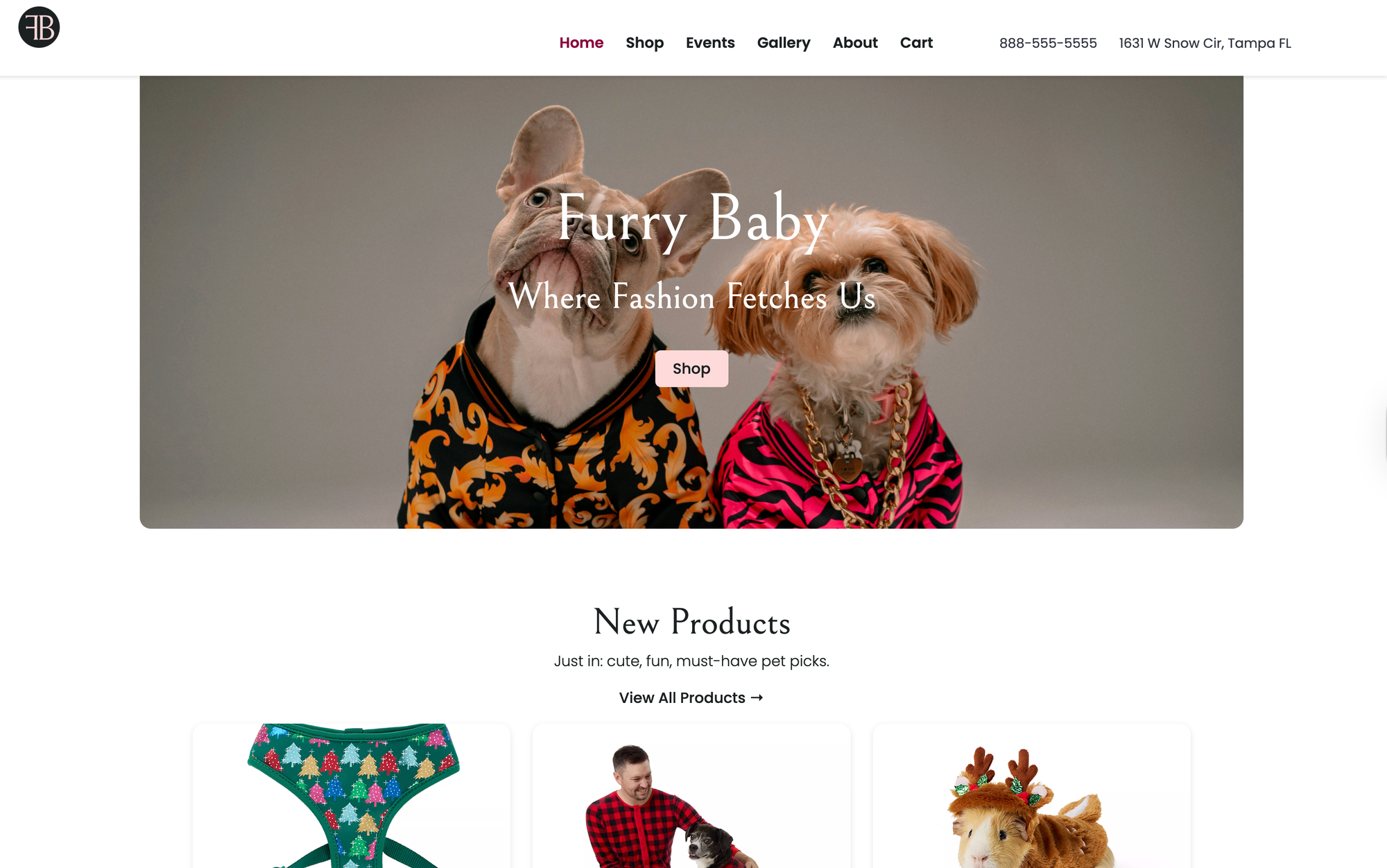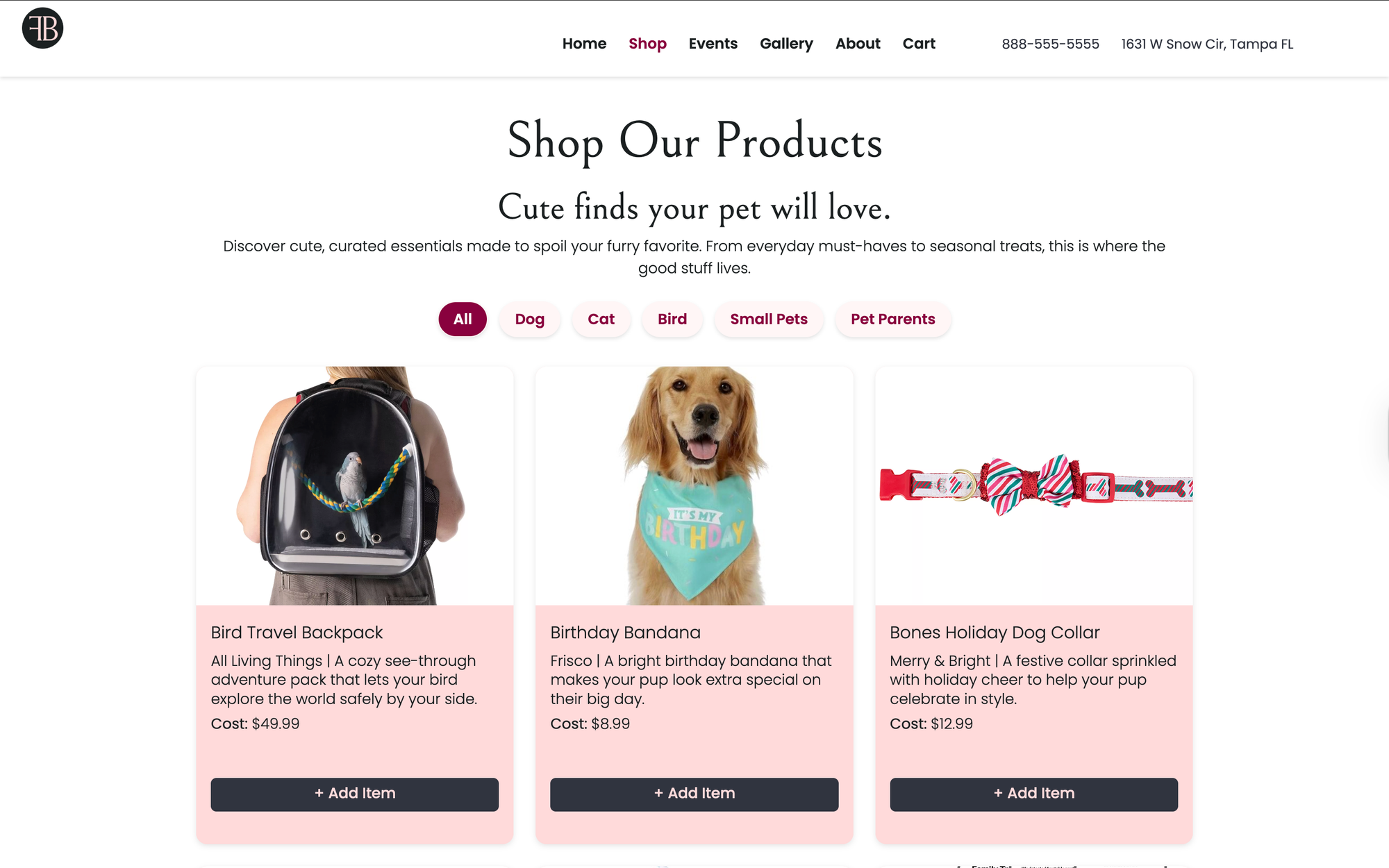 A full product design engagement for an upscale pet boutique: competitor audit, brand strategy, wireframes, and a hand-coded build from the ground up.
